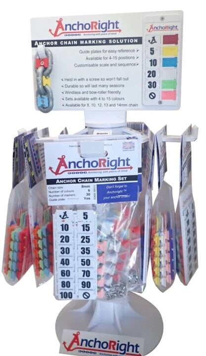 Markers won’t pop out unlike other solutions – they're screwed in place and designed specifically to stay put, 15 colours means you can mark every point on your anchor chain with a unique colour, no need for mixed colour codes, Mark from 4 to 15 positions on your chain, Clear, configurable guide plate included, Chain Markers engineered to stay in place for many seasons